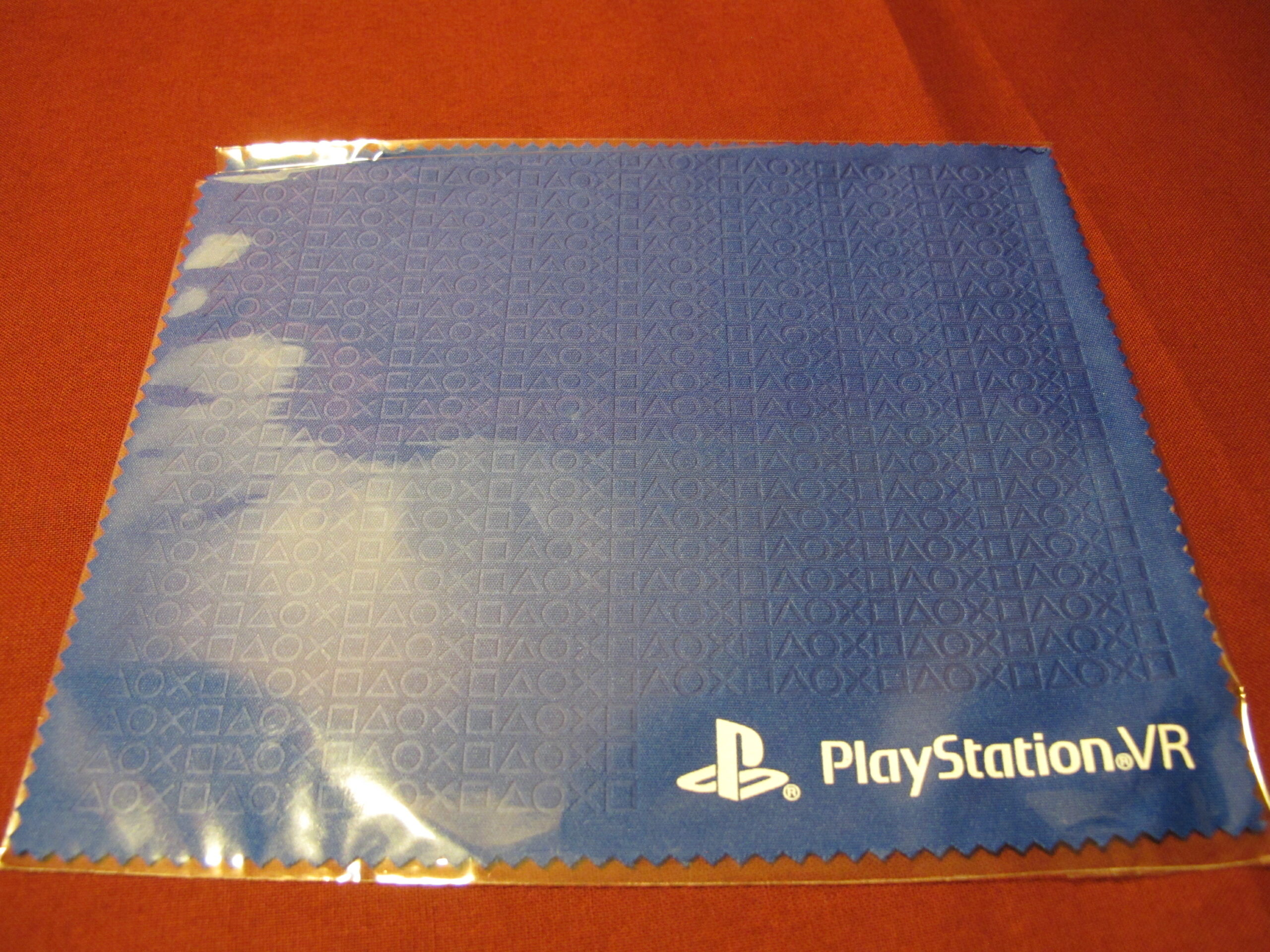 Mais ce n’est pas tout. Le constructeur japonais a soigneusement pensé à tout et nous a rajouté quelques petits bonus. En premier lieu, et non des moindres, une petite chiffonnette douce, qui va certainement s’avérer très utile pour le nettoyage des lentilles. Et soyons honnêtes, l’objet en lui-même est commun, et pourtant son inscription « PlayStation VR » et les logos des 4 touches de prédilection de la manette imprimés sur toute la surface font plaisir à voir.